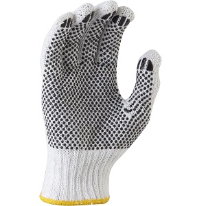 100% Cotton seamless knitted fabrics with one side PVC dots. Cream and dot Blue Ambidextrous, Natural cotton. Material handling, packing, maintenance, assembly, automobiles, shipyard, industrial cleaning, drilling operation, general warehousing etc.